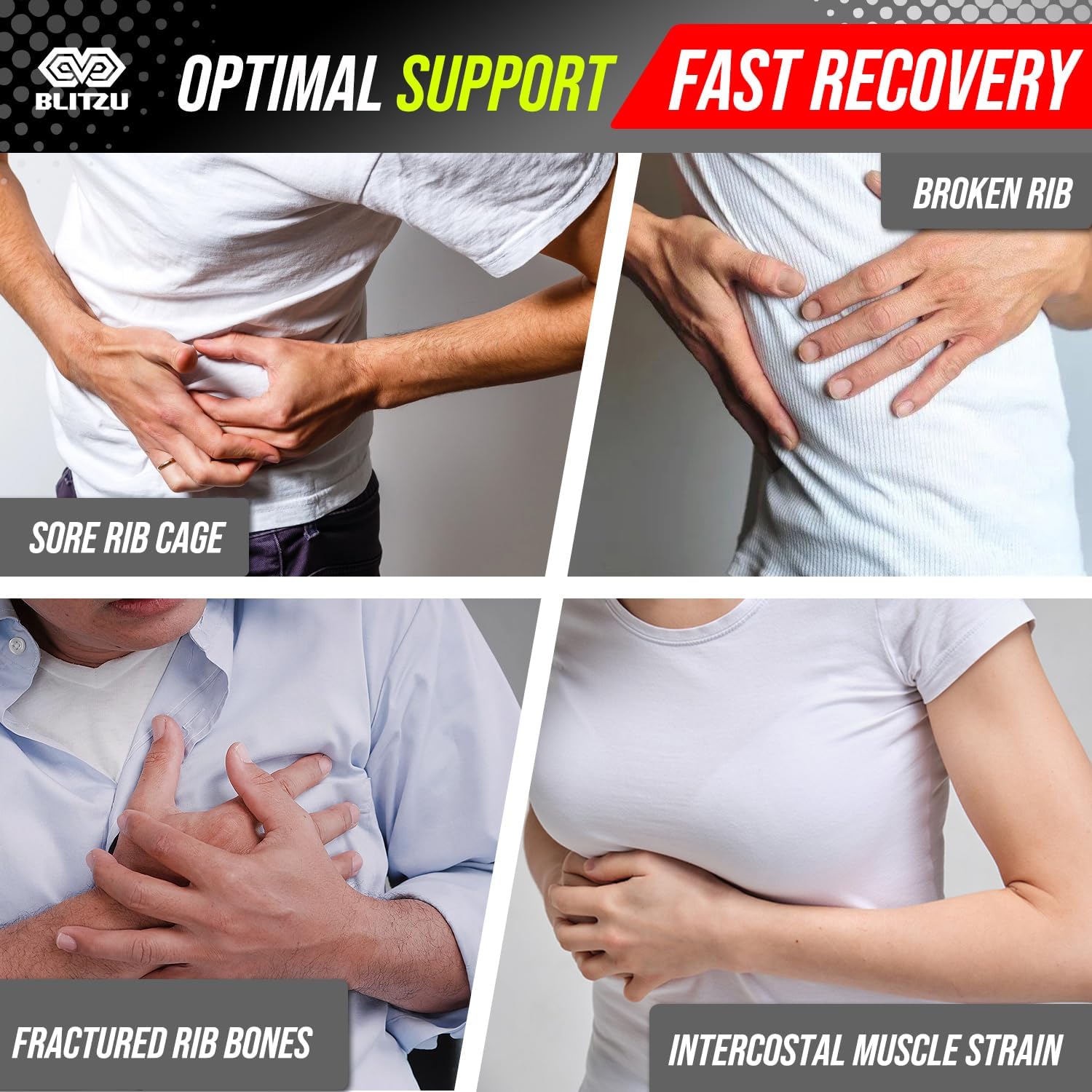 Provides support to abdominal injuries, and minimizes the risk of post-surgery complications.