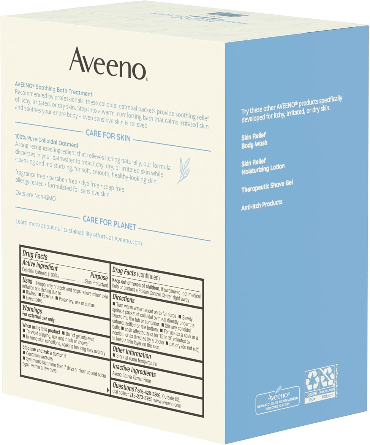 Aveeno Fragrance-Free Soothing Bath Treatment is an oatmeal bath soak with 100% natural colloidal oatmeal to relieve itchy, irritated skin due to poison ivy, oak, sumac, rashes, insect bites and eczema. Soothes skin from hives, rashes, sunburn, prickly heat (heat rash), and chicken pox. Each individually wrapped, single-use packet disperses in warm bath water to gently cleanse and moisturize, helping skin feel soft, smooth, and healthy-looking. The fragrance-free, paraben-free, dye-free, and soap-free formula makes it ideal for those with sensitive or irritated skin. Aveeno’s bath soak is designed for convenient, mess-free use at home or while traveling, offering a recognized ingredient to relieve itchy irritated skin due to eczema. To use, simply sprinkle one packet into warm bath water, stir to disperse the colloidal oatmeal, and soak affected areas for 15 to 30 minutes as needed or as directed by a doctor. This bath treatment provides a comforting bath experience that relieves and soothes, supporting temporary relief of minor skin irritation due to rashes, and poison ivy. From the dermatologist-recommended brand for over 70 years, pair with Aveeno Skin Relief Body Wash and Skin Relief Moisturizing Lotion to soothe your entire body.