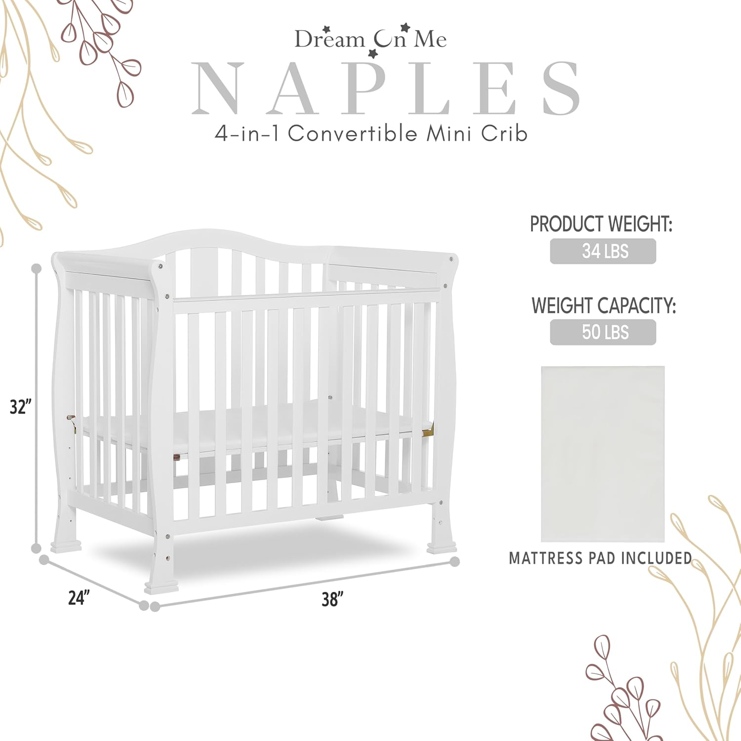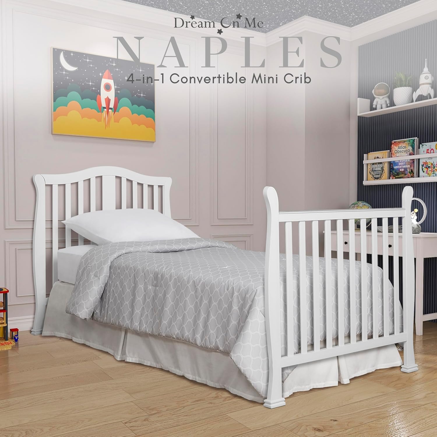 Every beautiful nursery begins with a dream — a dream of safety, comfort, and love. The Dream On Me Addison/Naples 4-in-1 Convertible Mini Crib turns that dream into a lasting reality, growing with your little one from their very first nap to their first big-kid bed. From the moment you bring your baby home, the Addison/Naples Mini Crib becomes the heart of your nursery — compact enough to fit perfectly in apartments, condos, or cozy spaces, yet spacious enough to give your baby the comfort they deserve. Designed with thought and crafted with care, it provides a safe, stylish, and space-saving nursery solution that makes every bedtime moment feel special. As your baby grows, this crib grows with them. Its 4-in-1 convertible design transitions effortlessly from a mini crib to a mini daybed, and later to a twin-size bed, with and without footboard (conversion kits sold separately). This makes it more than a piece of furniture — it’s a lifelong companion in your child’s journey, built for years of sweet dreams and cherished memories. Made from premium New Zealand pinewood, the Addison/Naples crib is as strong as it is beautiful. The three adjustable mattress heights allow it to adapt as your baby learns to sit, stand, and explore. Available in timeless finishes, it seamlessly complements any nursery décor — from classic to contemporary. Your baby’s safety is always the first priority. That’s why this crib meets or exceeds ASTM and CPSC safety standards and is GREENGUARD Gold Certified, meaning it has been tested for over 10,000 chemicals and VOCs to ensure cleaner indoor air and a healthier sleep environment. It’s also Baby Safety Alliance verified and CPSIA compliant, with lead and phthalate levels far below federal limits — so you can rest easy knowing your little one is surrounded by safety. The included 1-inch mattress pad adds comfort and convenience, and the crib fits any Dream On Me GREENGUARD Gold Certified mini crib mattress for a snug, secure fit. Measuring 38″L x 24″W x 32″H, it’s the perfect combination of practicality and elegance — ideal for parents who value both design and functionality. The Dream On Me Addison/Naples 4-in-1 Convertible Mini Crib isn’t just a crib — it’s where your baby’s story begins, night after night, surrounded by safety, love, and the promise of tomorrow.