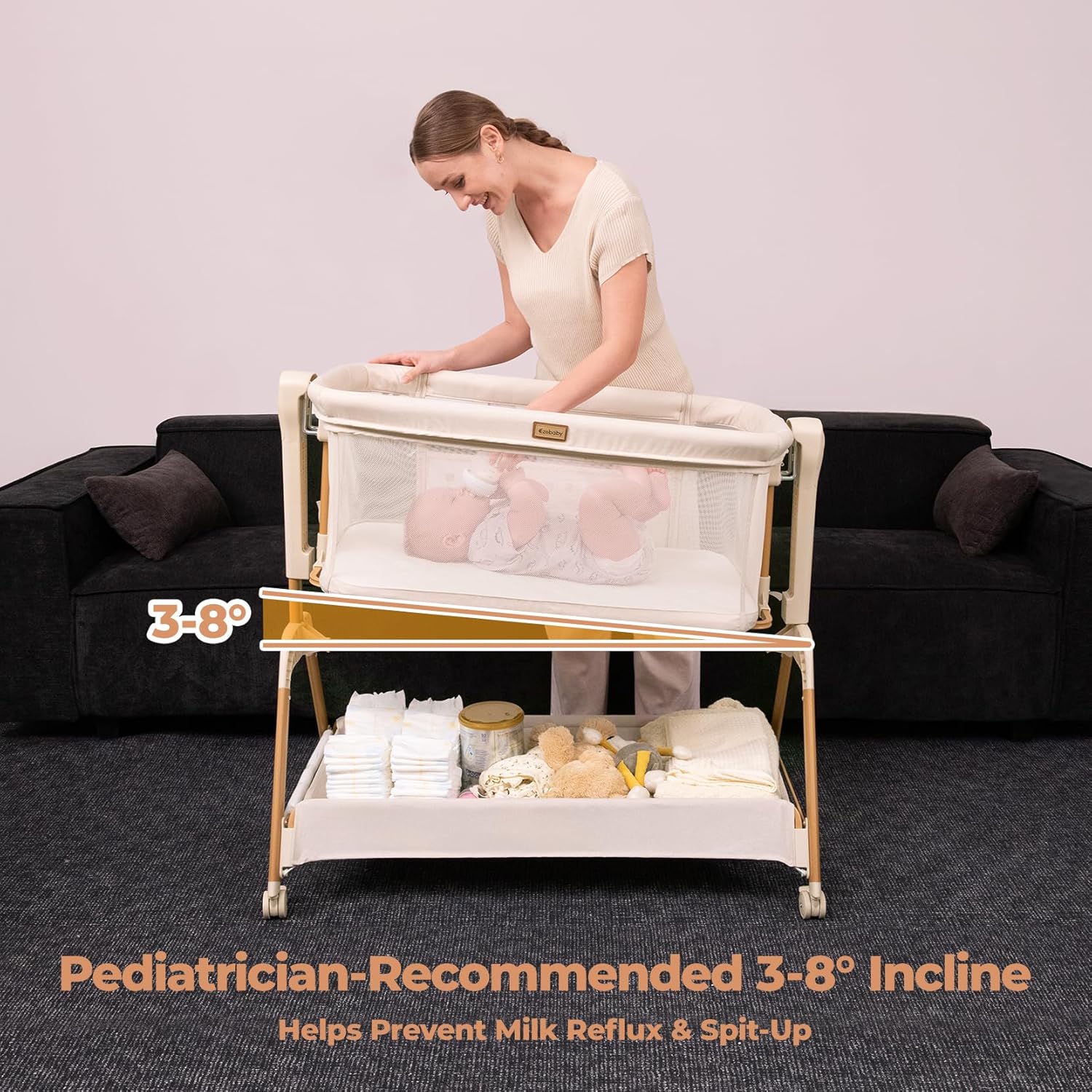 Cozy Bedside Bassinet – Features a comfortable mattress pad that provides the ideal blend of softness and support for your baby’s comfort. This bedside crib also includes a large storage basket below, keeping all your baby essentials within easy reach