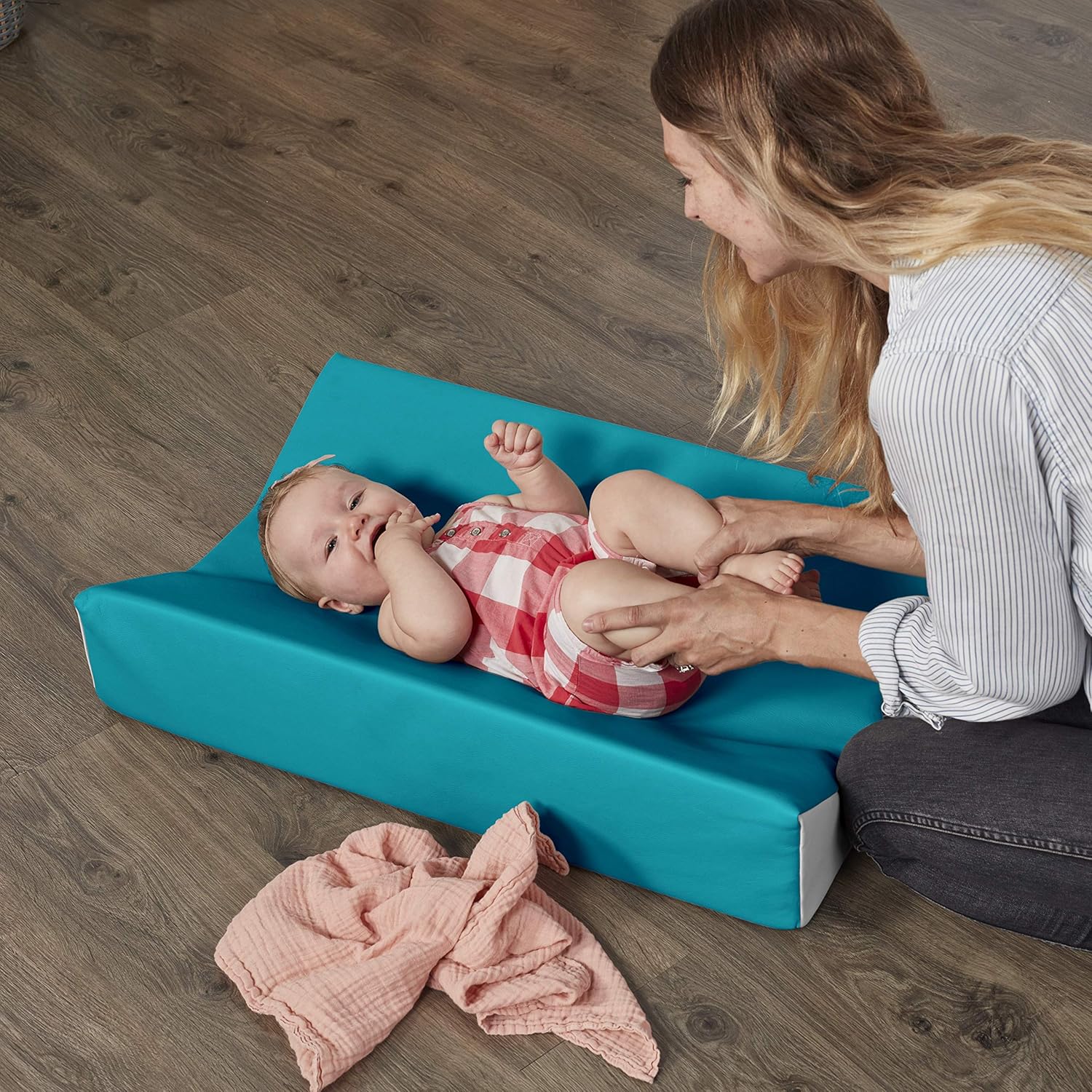 SoftScape Ultra-Soft Baby Changer is the perfect changing companion! The gentle, sloping sides help keep your little one secure and in place during diaper and clothing changes. Comfortable dense foam core encased in soft, leather-like polyurethane fabric. No need to worry about messes, the durable material is water-resistant. Just wipe down with sanitizing soap and water solution. Built-in handle makes it easy for you to pick up and transport around the home or on the go! Wide base features a special non-slip fabric that keeps changer in place during use.Perfect for homes, daycares, churches, schools and more.