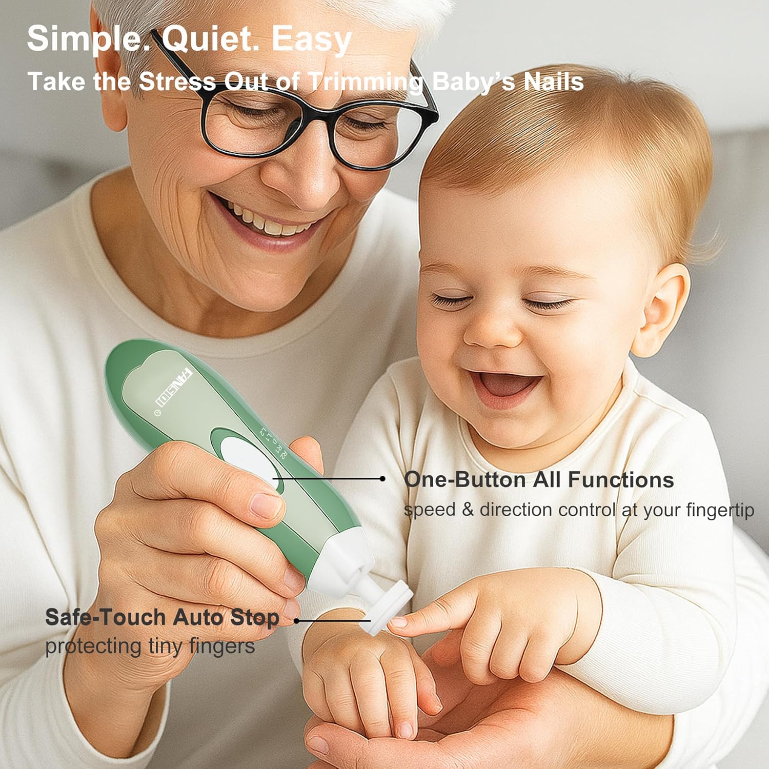 Designed with a streamlined body that fits comfortably in any hand, the Fansidi nail trimmer allows for precise, gentle trimming — even for first-time users. One intuitive switch controls direction and speed, while the pressure-sensing safety feature automatically stops if pressed too hard, protecting your child from accidental injury.