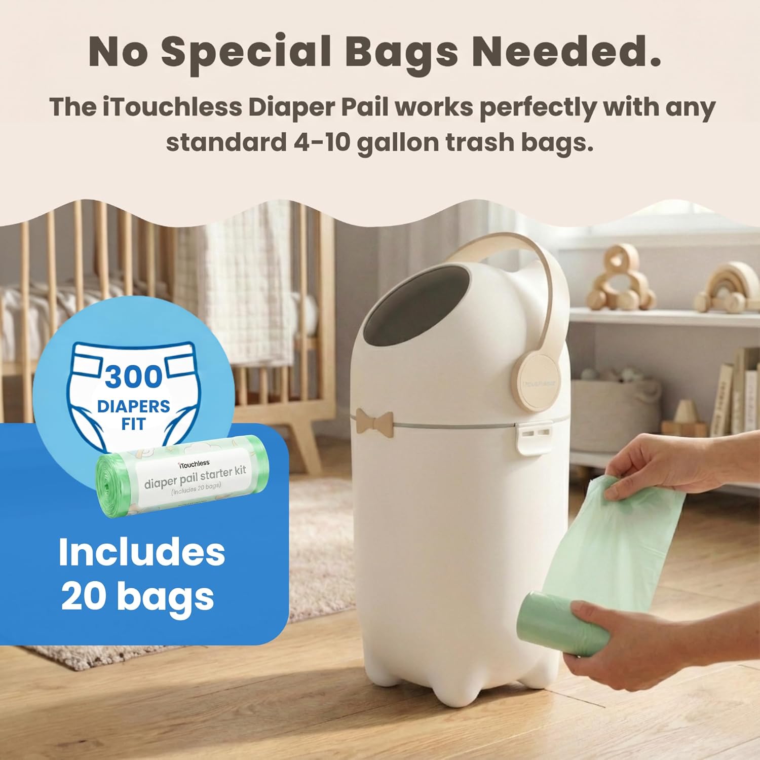 Unlike other diaper pails that require expensive proprietary cartridges, the iTouchless Diaper Pail works with any regular trash bag. That means fewer ongoing costs, easy replacements, and no being locked into brand-specific refills—just simple, practical odor control for everyday use.