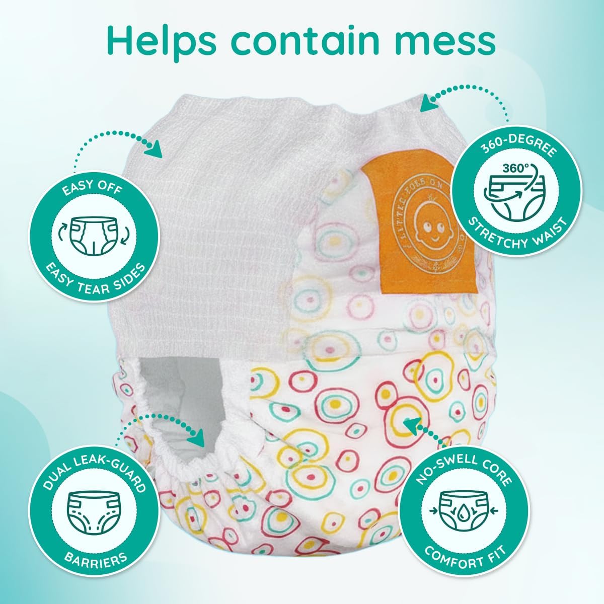 SECURE 360° STRETCH FIT WITH EASY TEAR-AWAY SIDES – Features a flexible 360° waistband, cinched sides, flexible leg cuffs, and a rounder bottom for a snug, comfortable fit that moves with your baby during active play, while pull-up design and tear-away sides enable quick, clean, mess-free diaper changes without sagging or leaks.