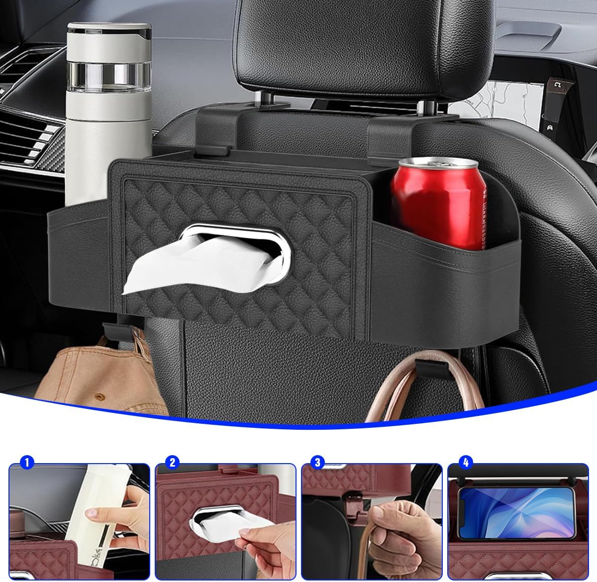 Simple Installation: Our products are easy to install. You don’t need to remove the headrest or use other tools to complete the installation and use. First, you need to snap the hooks onto the edge of the storage box. Next, you should hang the hook on the headrest of your car. Finally, you need to push the hook inward slowly and adjust it to the proper headrest spacing to keep your car neat and organized.