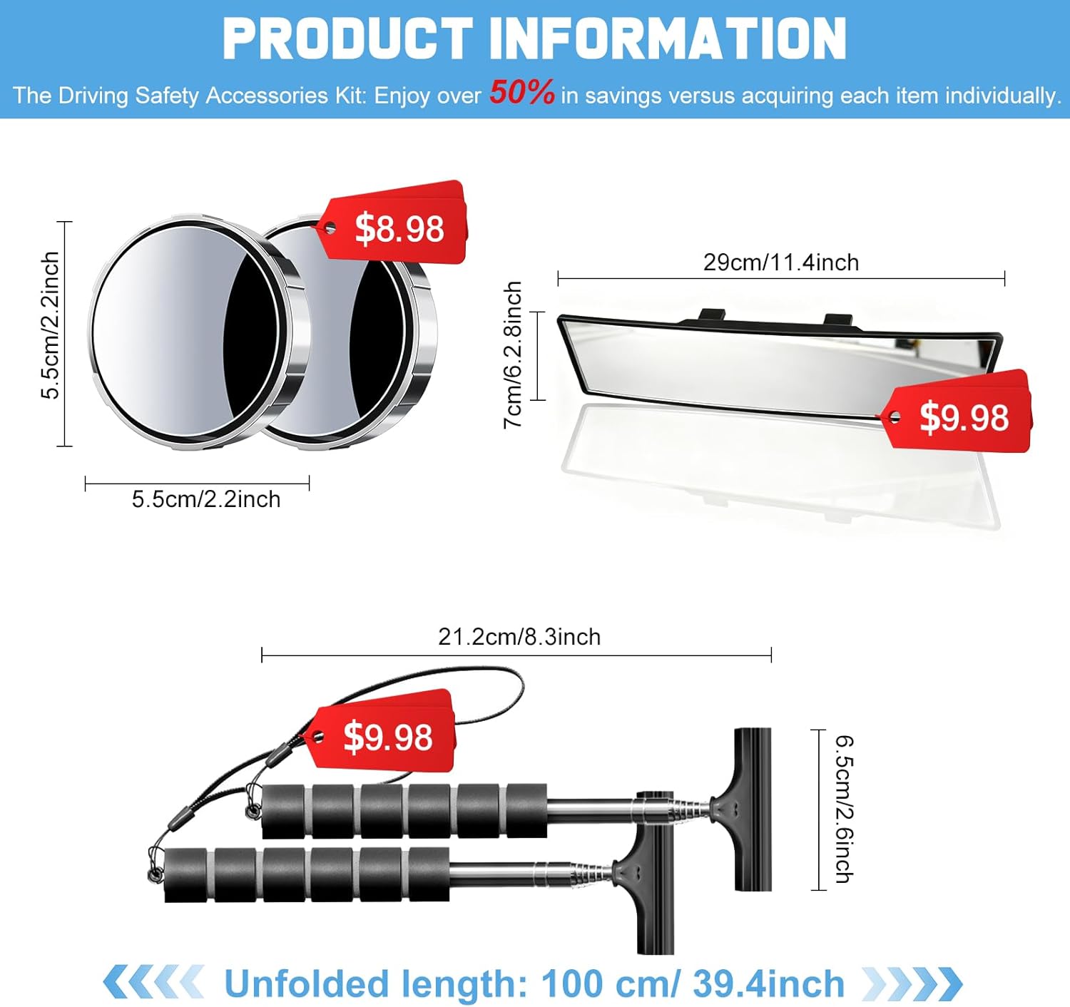 This driving safety mirror kit is designed to improve visibility and confidence behind the wheel. The wide angle rear view mirror provides a broader field of vision, while suction cup blind spot mirrors offer flexible, no-residue installation and easy adjustment. Two mirror wipers help keep side mirrors clear in rain or fog. Simple to install and suitable for most vehicles, this kit is ideal for new drivers, teen drivers, women drivers, and anyone driving in bad weather.