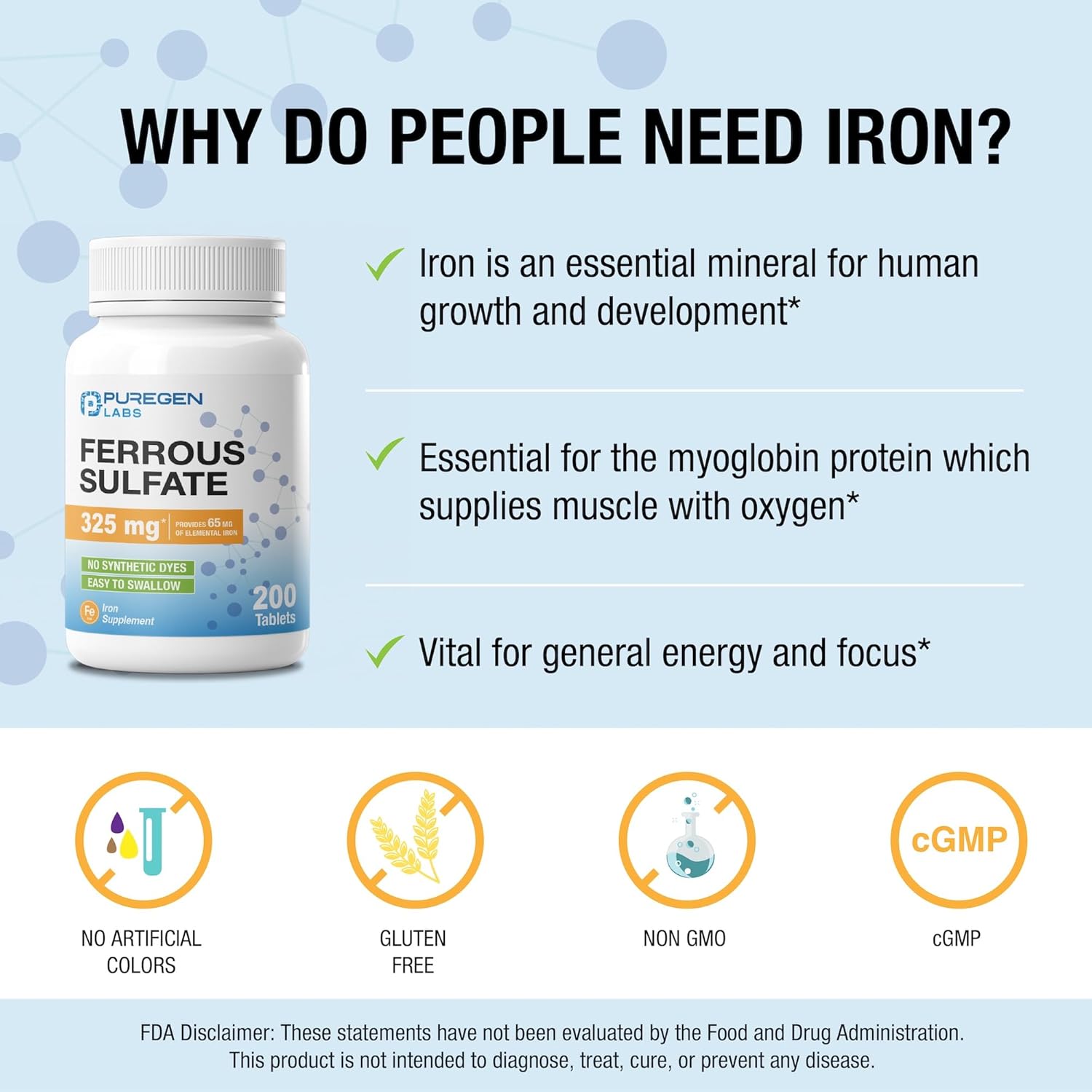 9 reviews for Puregen Labs Ferrous Sulfate 325 mg (65 mg Elemental Iron) High Potency Iron Supplement | No Artificial Color Additives – 200 Tablets