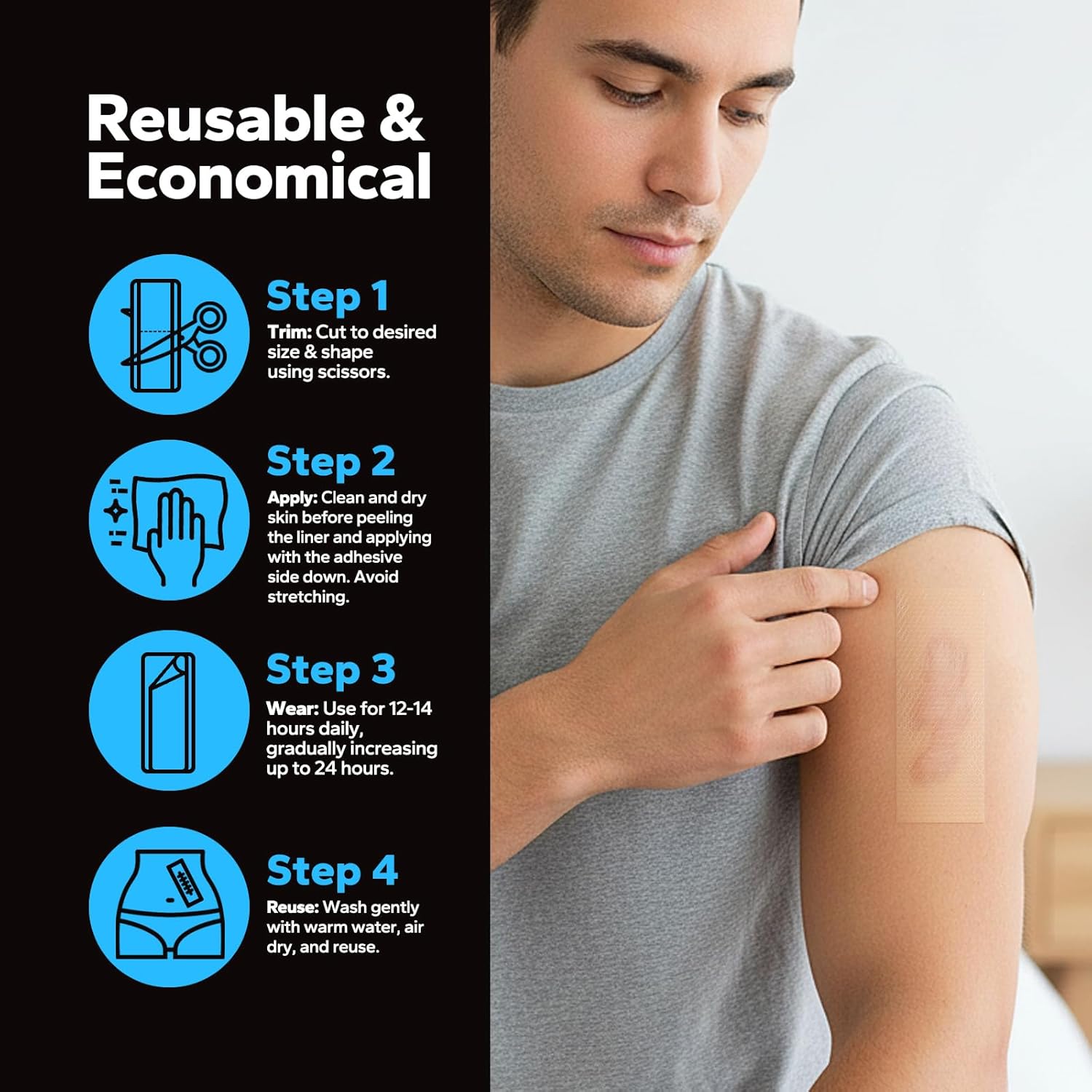 Comfort & Discretion: The product is ultra-thin, breathable, soft, and flexible. It can be easily trimmed to fit any body part perfectly. It stays securely in place and is virtually invisible when worn, ensuring comfortable 24-hour repair without affecting daily activities or appearance.