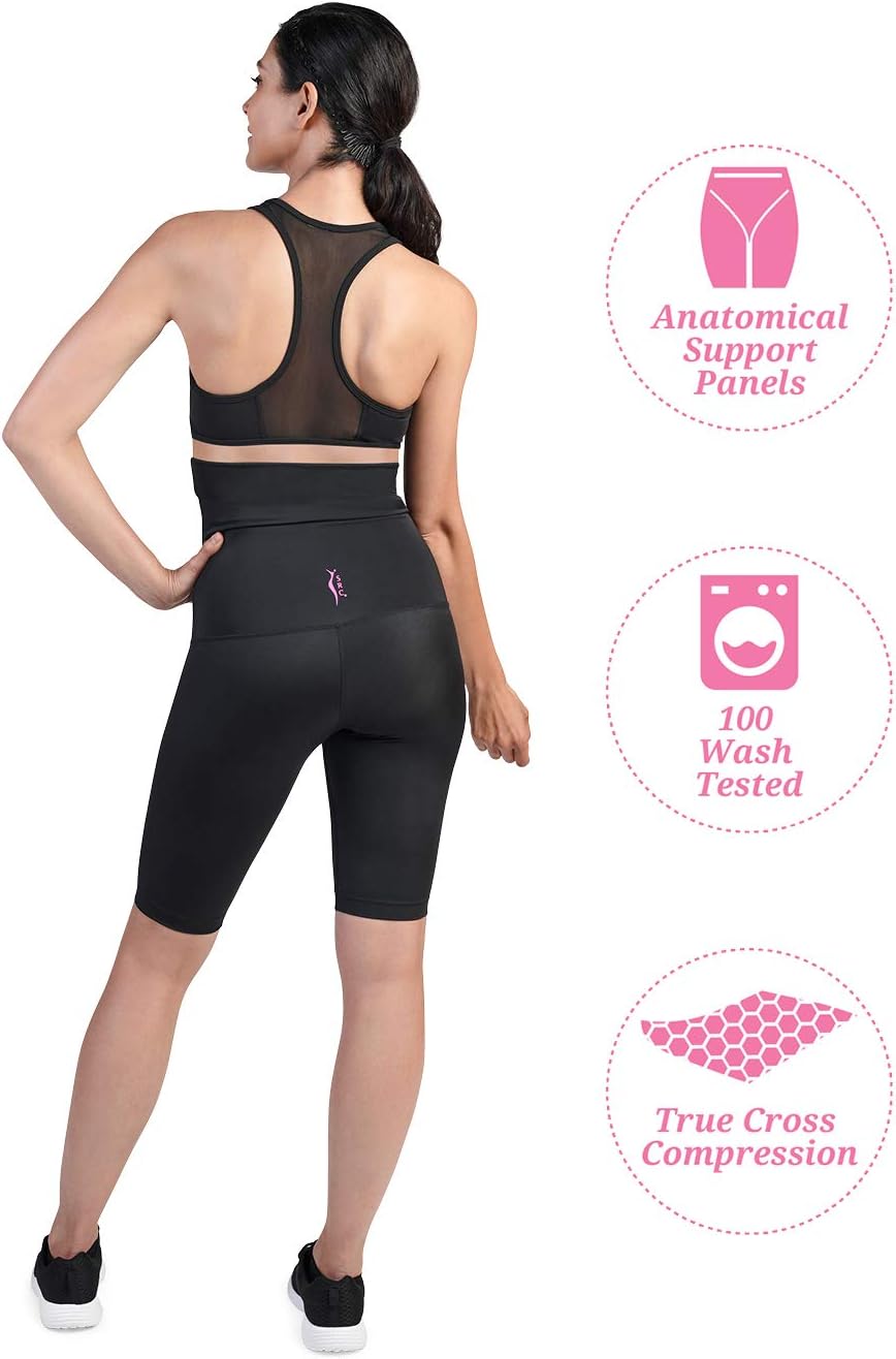 These post maternity shorts offer superior support without any feeling of restriction to the changing female body with gentle consistent medical grade compression. The multiple layers of compression in the postpartum maternity shorts within the anatomical panels including the gusset panel, have been shown to significantly help with the pressure associated with Vulval varicose veins.