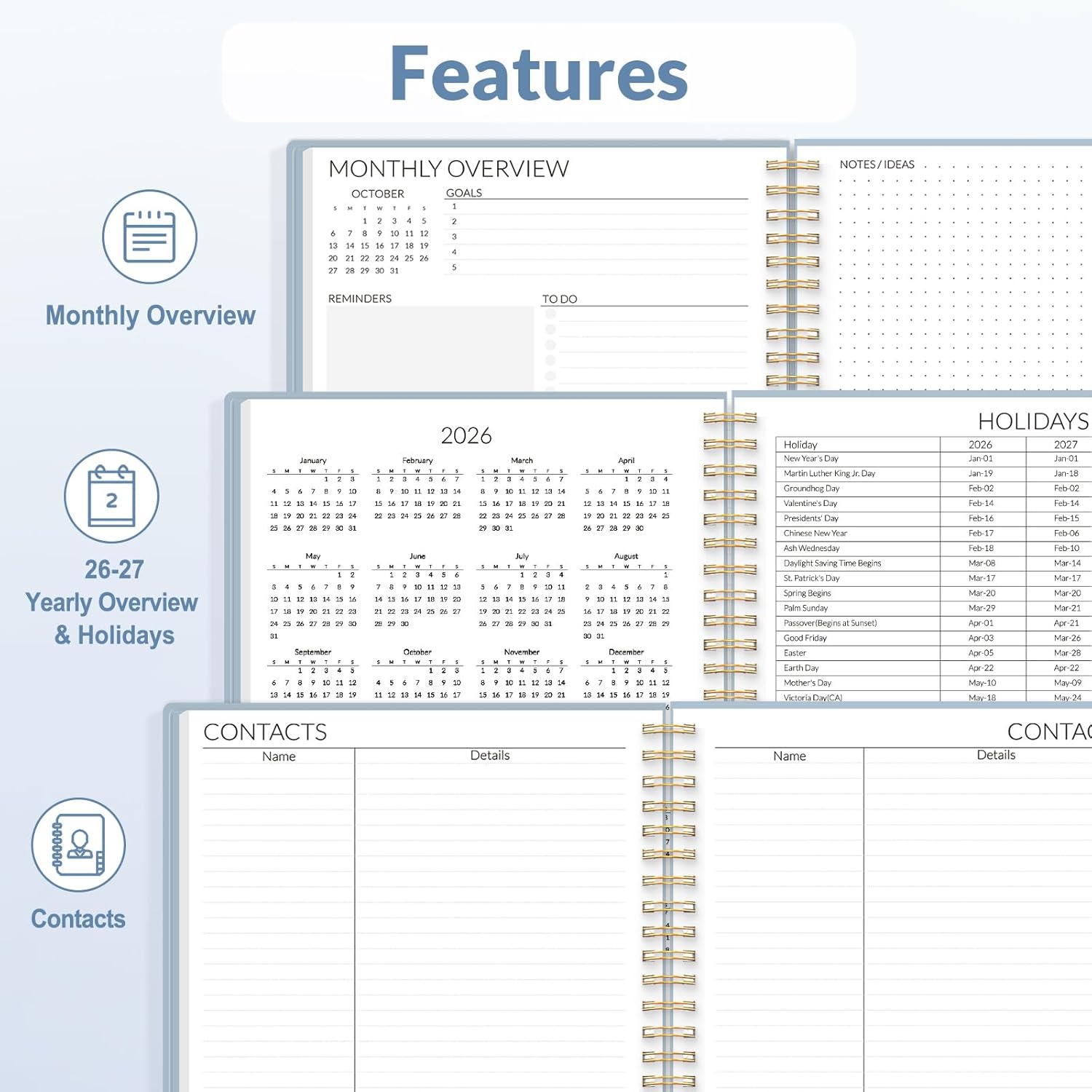 ADDITIONAL FEATURES: Includes 26-27 yearly overviews, 2026 & 2027 vertical year schedules, holiday lists, contact and notes pages, and clear pockets. Rainbow monthly tabs offer easy navigation and add a stylish touch to the planner’s design.