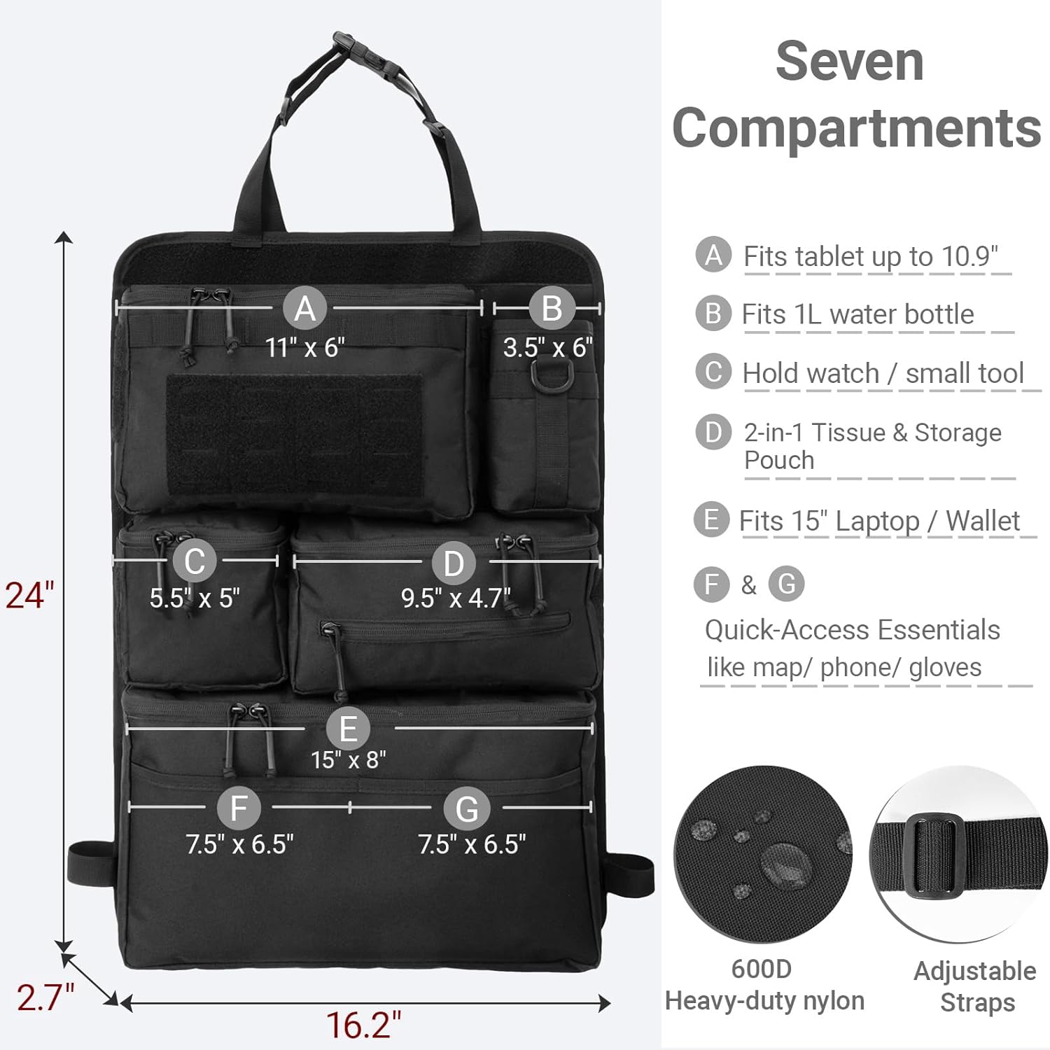HEAVY-DUTY & DURABLE FABRIC: The tactical car seat back organizer crafted from high-density 600D Nylon Oxford fabric, features premium heavy-duty zippers and reinforced stitching. It resists tears, abrasion, and water-resistant moisture, guaranteeing your gear is protected anywhere.