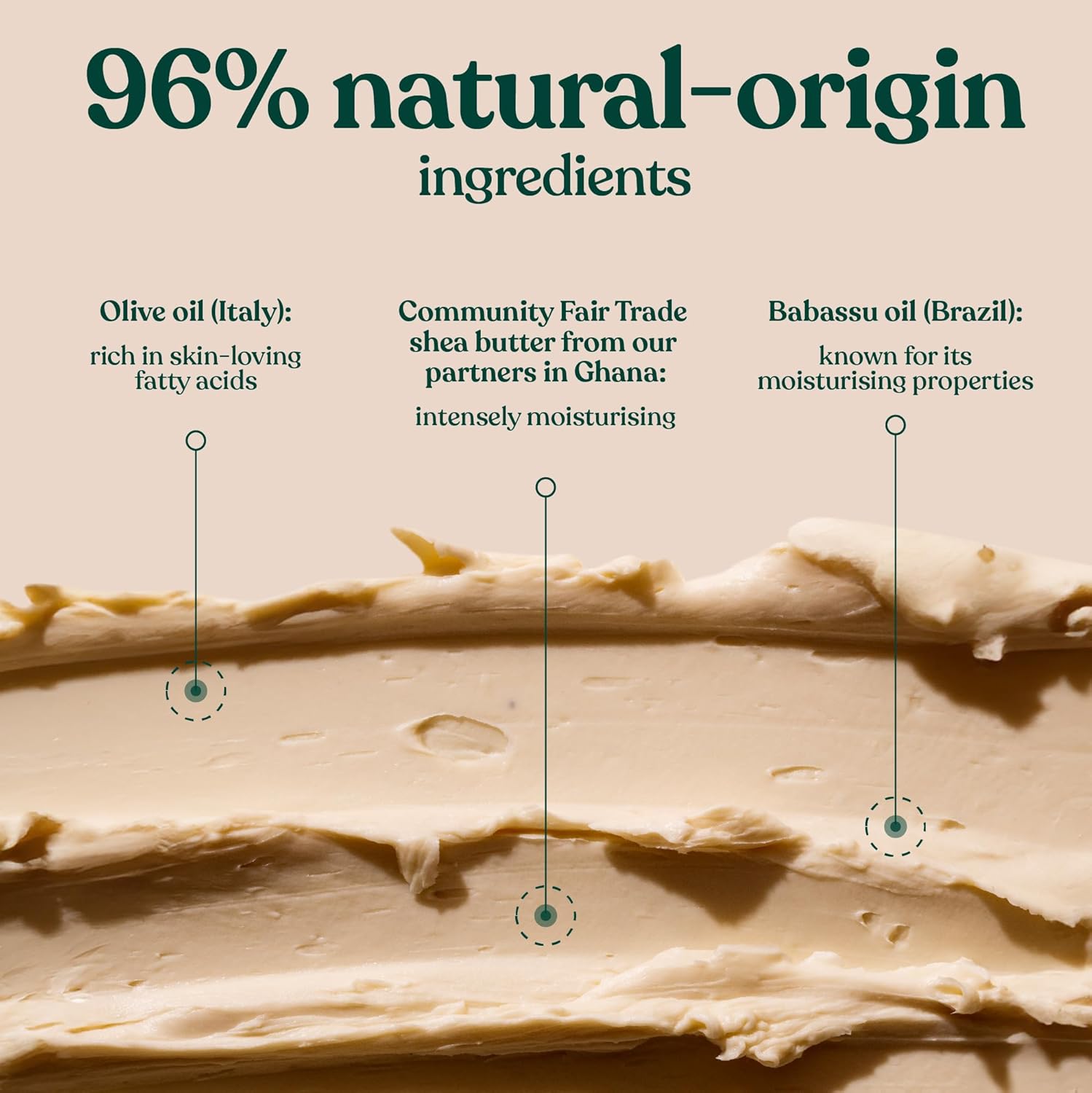 Quality ingredients with positive impact: Now made with 96% ingredients of natural origin, including Community Fair Trade olive oil from Italy, handcrafted Community Fair Trade shea butter from Ghana and Community Fair Trade babassu oil from Brazil