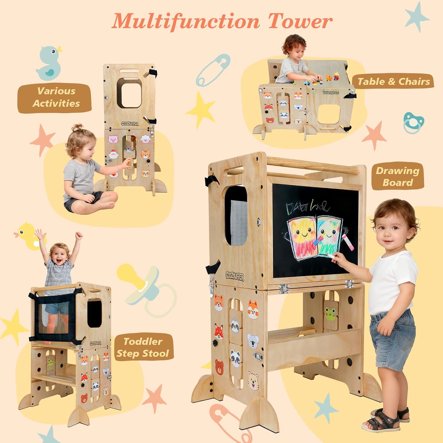 【Multi-Functional Kids Furniture】Easily transforms from a toddler standing tower to a toddler table and chair set with simple locking mechanisms! Designed to grow with your child, it includes functional elements like a chalkboard. Supports up to 150 lbs, ensuring safety for daily use in kitchen or bathroom.